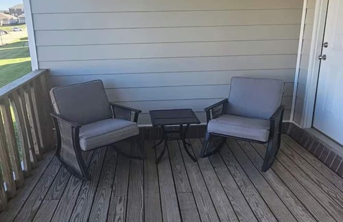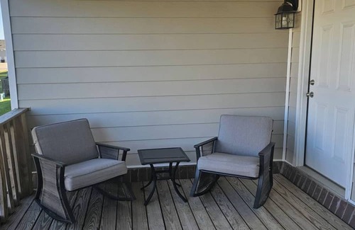 Outside: There is a front and back covered porch, with two rocking chairs on the back porch. Please note the back porch is shared with the other duplex unit.