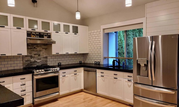 Welcome to our cozy 3-bed, 2-bath Home in the heart of Happy Valley. Enjoy a spacious living area with tasteful decor and a large flat-screen TV. The fully equipped kitchen and dining area for six make mealtime a joy. Bedrooms feature two queen, and two twin beds with quality linens, and the master includes an en-suite bathroom. Relax in clean, stocked baths. Outside, a private patio offers neighborhood views. Experience comfort and convenience–booktoday!
