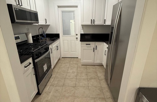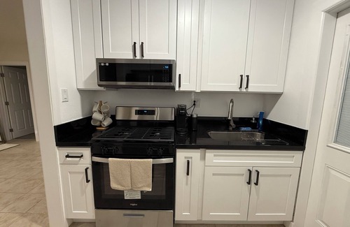 - Full kitchen with stove/oven, airfyer, microwave, Keurig, milk frother, and water kettle