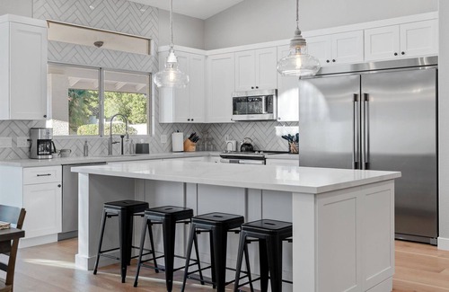 Our stunning private outdoor area boasts a covered patio furnished with table and seating overlooking a **heated pool (in the winter‐see note), six hole putting green, beautiful turf for corn hole, bocce ball, ladder ball, etc. Gas (propane) fire pit area with seating, and a Weber BBQ. Easy to spend all day outside enjoying all the amazing amenities offered in our peaceful private backyard. Pool is within our private backyard, but not separately enclosed, we have high door handles and locks on the doors that access the backyard, but you are responsible for watching all guests and children around/in the pool area. There is no lifeguard on duty.