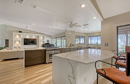 This home boasts an array of premium amenities to make your stay unforgettable. Enjoy relaxing in the spacious great room with direct waterfront views, or take advantage of the gourmet kitchen equipped for any culinary endeavor. A large master suite offers a private escape with access to the pool and an opulent bathroom featuring Turkish marble and a Jacuzzi tub. Additional features include a Baldwin baby grand piano, outdoor fire pit, dock access for boating adventures, and recreational options like kayaking and paddleboarding right outside your door. For larger gatherings, a studio space for four can be rented separately, enhancing your experience with even more comfort.