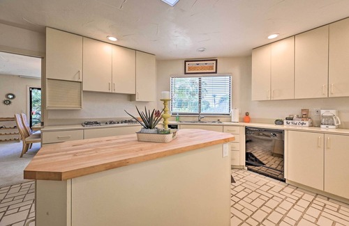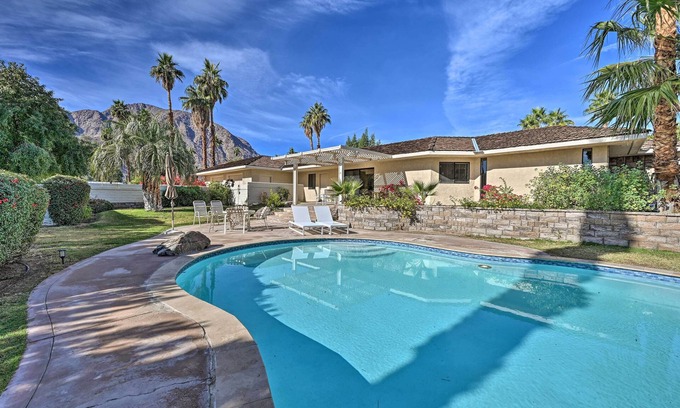 This spacious three-bedroom home is the perfect blend of nostalgia and relaxation. This comfortable retro retreat is located on beautiful De Anza Country Club, with great golf course and mountain views. Close proximity to town, golf, tennis, mountains, hiking, bike riding, wildlife viewing, stargazing, and more. You may even be treated with a visit from the local mountain sheep grazing on the golf course. This custom estate is filled with character and offers all the modern amenities you need for a comfortable stay. Originally built as a custom golf course estate, this spacious home boasts over 3,000 sq foot of living space on an acre lot with a gorgeous backyard pool with waterfall, spacious en-suite Master Bedroom 1 with a king sized bed, 2nd Master Bedroom with two queen sized beds and en-suite bathroom with a shower, and a third bedroom/den with a king sized bed, sofabed, and office space. An additional powder room in the main hallway adds convenience for guests staying in the den. Kitchen boasts an eat-in area, wood block island, original built-in Sub Zero refrigerator with ice maker, Thermador stovetop, double oven, dishwasher, microwave, toaster, blender, and complimentary coffee station. Backyard oasis features a private pool and several patios to enjoy outdoor dining and lounging. Fully furnished home captures original vintage-era flair with a sunken living room, tray ceilings, retro wet bar, formal dining room, vintage high-end appliances, and beautiful private portico entrance. We welcome long-term guests! Please contact host directly to negotiate your long-term stay discount. Disclosures: For young families, pool does not have its own fence perimeter, but pool is located inside a fully fenced back yard. Pool is unheated. *Ring security camera located at front door and garage entrance of home.*