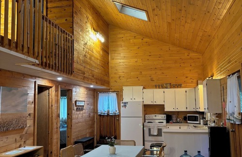 On the main floor you’ll find the kitchen with ample counter space and essential appliances and cooking utensils. The open concept dining/living area is perfect for having dinners, playing card games, or relaxing. Enjoy all the comforts of home with the spacious bathroom featuring a clawfoot tub, tiled shower and indoor plumbing (if needed, there is also an outhouse outside). Stay cool in the summer months with two AC units.