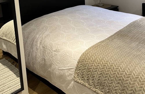 Prepare a home-cooked meal in the kitchen, complete with an oven, a stovetop, and a refrigerator, as well as a coffee maker, an electric kettle, and a microwave. Bathroom amenities include a hair dryer, towels, and toilet paper. Other amenities include a living room, bed sheets, an ironing board, and heating.