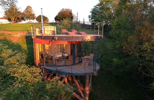 This unique lodge has a large circular bay window opening onto a terrace 6 metres high to enjoy the outdoors even more and let the light in.