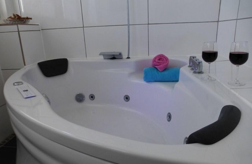 The bathroom is large. In the tub, you can shower or spend a relaxing evening in the hot tub. It offers enough space for towels and toilet bags of all guests. Kids love the bathtub.