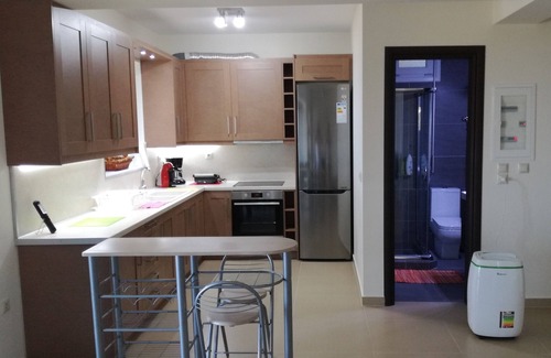 The apartment has also a fully equipped modern kitchen with ceramic hobs, oven, big fridge, coffee machines and toaster. A washing machine for clothes is also available, with ironing machine and an ironing board. A comfortable table with chairs, as well as a garden living room is available. A flat screen TV and wifi internet connection (free of charge) is also provided.