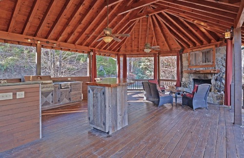 Sleeps 10, Amazing outdoor living area complete with kitchen, fireplace, TV, Music, Grill, Ice Maker and Bar. You will not want to come back inside but when you do, you'll find all the comforts needed for a wonderful stay. There is a dock which can accommodate 2 boats and/or jet skies just steps from the house. (This is a TVA lake and levels are controlled by the TVA.Typically from September - April, lake levels are reduced, restricting the use of the dock.) Three levels of decks two of which are screened in. In and outdoor dinning areas. Plenty of parking. Gated community with paved roads. Great fishing, hiking, site seeing, antiquing, dining, bars and restaurants. Only 8 miles from town. We found Blue Ridge 5 years ago and never left, we love it there.