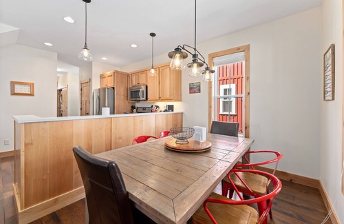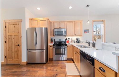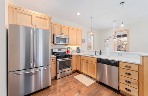 The main floor includes a stocked, sparkling kitchen with all the modern amenities you could ask for stainless steel appliances, quartz countertops, a dishwasher, a gas stove, and much more! The dining room table has to seat 6. The living room features a gas fireplace, a 50" TV with Chromecast, plenty of comfortable seating, side tables, and lighting. The master bedroom is on the main floor with a king-size bed and an en-suite bath featuring a pedestal sink and shower/tub. There is also a half bathroom right off the kitchen. Additionally, the main floor features a full-size, front-loading washer and dryer.