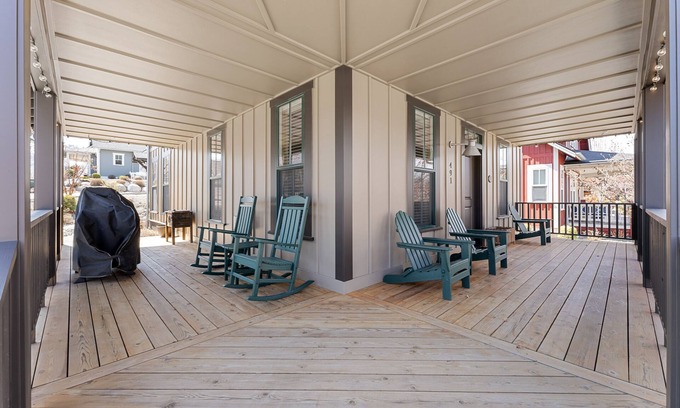 Lone Star features a master suite on the main floor and two bedrooms, and a media room on the second floor. The paved stone patio and wraparound porch on two sides of the home create the ultimate outdoor living space. This charming home has comfortable furniture and a gas fireplace for staying cozy during those cool evenings. The house has high-speed WiFi and HDTVs upstairs and downstairs with Chromecast so you can easily stream your favorite content on the TV. There are also board games and puzzles to enjoy.