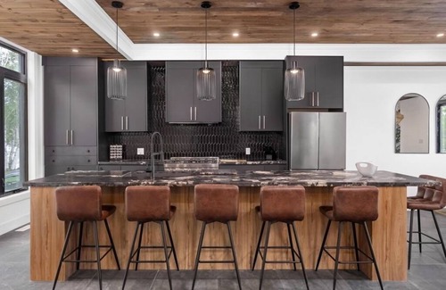 When staying at Malibu in Muskoka holiday rental, you will have exclusive access to the property, including the prime lake frontage with sandy shores. It provides extremely safe swimming for kids and is also excellent for water sports. From this prominent waterfront position, the custom home overlooks the lake, giving magnificent views from the property's many balconies including a MASSIVE 500 square foot third floor patio area three storeys high. The home features an expansive open-plan living across 3 levels, boasting 10 foot ceilings throughout and 20 foot cathedral ceilings in the living room.