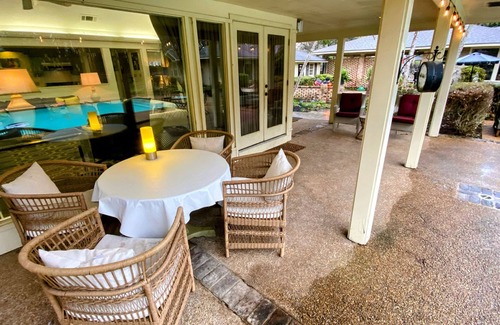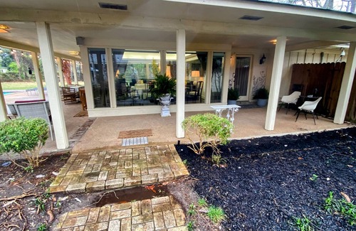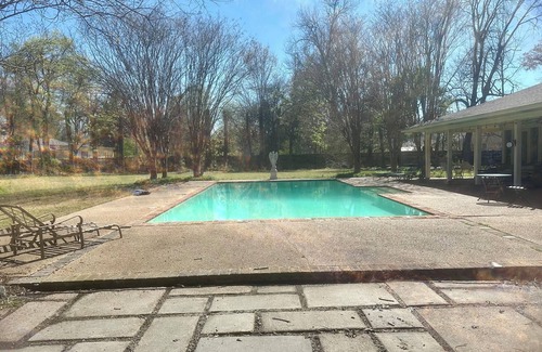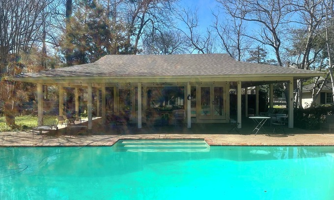 The Oakhurst Guesthouse sits on what is considered one of the finest residential properties in Clarksdale, Mississippi. The guest house was refurbished and decorated in March 2024 by a professional designer. The bedroom is to die for. It is cozy with a King sized iron framed bed and blackout curtains. The living room has three all-glass walls looking out over the beautiful pool and property. The pool is right outside your front door, with a large overhanging patio and comfortable furniture. The pool will be open May 1st through October 31st, and will be shared with the other guest house on the property. The kitchen has a gas stove, if cooking is your thing. The property is located approximately 1 mile from downtown and the juke joints, restaurants, and blues festivals. It is fenced, and very private. The owners live on site in the main house, and will be available for any sort of assistance that you need. You will feel right at home. Come visit Clarksdale!