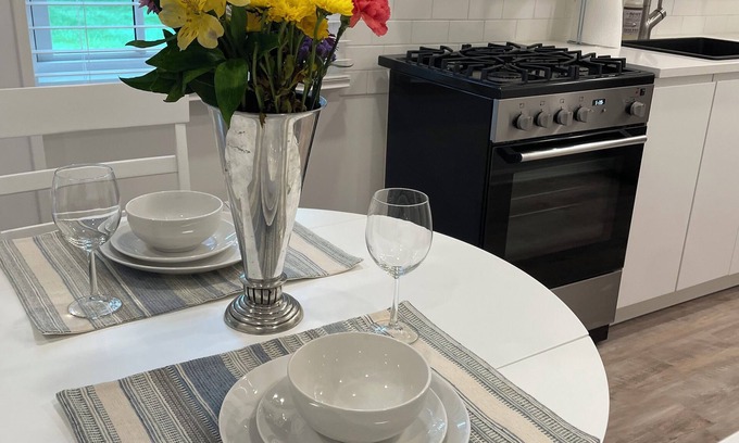 As you step into the private entrance of this thoughtfully designed apartment, you will feel a sense of comfort and tranquility. The open floor plan seamlessly combines the living, dining, and kitchen areas. Whether you are visiting for business or pleasure, rest assured that a good night's sleep awaits you in the king sized Wink bed.