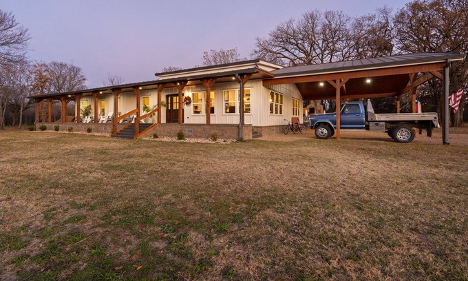 As you step onto our ranch, you'll be greeted by the breathtaking sight of 300-year-old oak trees standing tall against the Texas sky. Our 2,376 sq ft farmhouse, adorned in the timeless style of Chip and Joanna Gaines, offers you a cozy retreat with 4,000 sq ft of inviting patio and porches. A 4-car cedar carport ensures your vehicles are kept safe and protected.