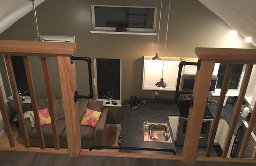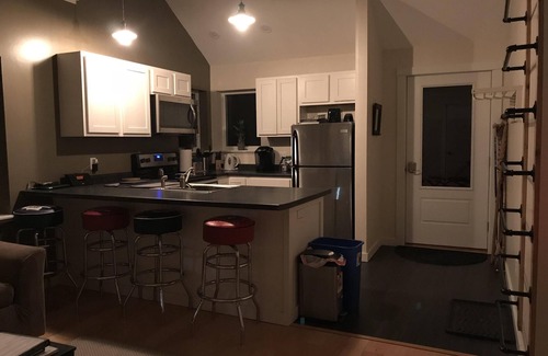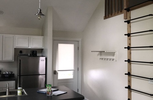 Our apartment is a non-smoking home, located on a non-smoking* property. The apartment is recently constructed within our newly constructed garage. Private entrance in side yard. Apartment consists of one bedroom with queen size bed and closet, full kitchen with stainless steel appliances and bar style seating, living room with sofa bed and a full bathroom which contains a washer and dryer. The space also contains an additional sleeping loft with a queen bed. It is new and has a cozy yet contemporary feel!