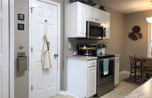 The main floor apartment* is well appointed with new linens, plush towels, original artworks, and an eclectic mix of mid-century modern antiques and contemporary furnishings. Our kitchen is set up with tailgating in mind! From a full compliment of prep equipment to the French door refrigerator ready to accommodate large trays of tailgate treats, there's ample space to prepare for a big game or a graduation celebration.
