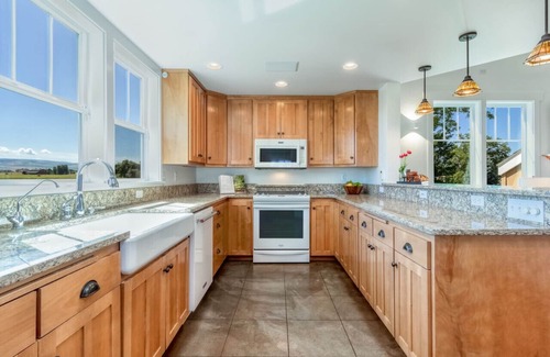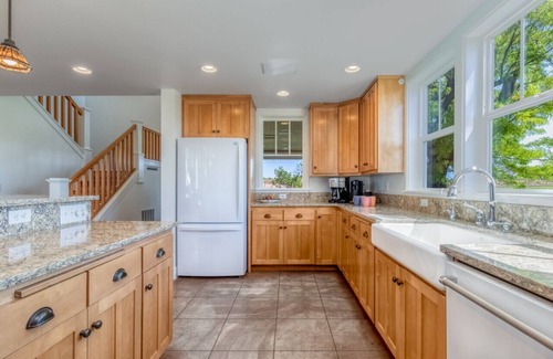 The property boasts a large, open and updated kitchen, connected to the living area via a stone counter with barstools. The living room has comfortable furniture and a gas fireplace to keep the main living room with vaulted ceilings warm and cozy. An upstairs loft media room with sitting area overlooks the open concept living room below. There is a lovely separate dining room on the main level with views of the vineyard and the Blues.