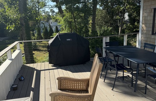 Welcome to Shelter Harbor. Relax on the fabulous second floor deck for coffee, cocktails, dining, and relaxing. Kayaks available to ride over to the Shelter Harbor beach, also available by car. Take a quick bike ride to the dock for a swim or to the tennis courts to hit some balls. Quonnie pond offers hours of fun: clamming, fishing and swimming when you need a break from the beach. The house sleeps 8 with the extra pullout sleep sofa. Available year round. Hot Tub + firepit are new editions in 2024!