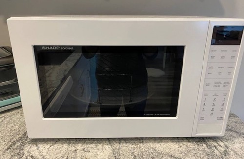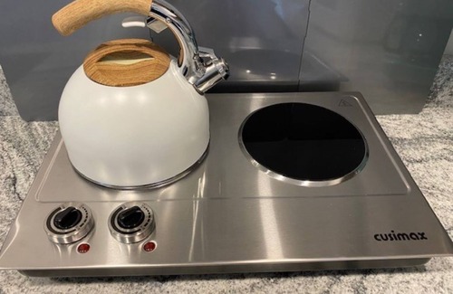 The kitchen is well-equipped with essential appliances such as a fridge, dishwasher, air fryer, convection microwave oven, and hot plates. Additionally, there is a breakfast station with a toaster oven, a Keurig coffee maker (with K-cups), and another toaster. Please note that there is no full-size oven range available.