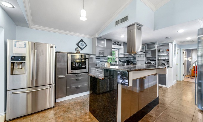 The Living room features a massive 85" Smart TV for your viewing pleasure! The huge sofa opens up to a Queen-Size Sleeper sofa with an upgraded memory foam mattress! Equipped with a decorative fireplace and plenty lighting.