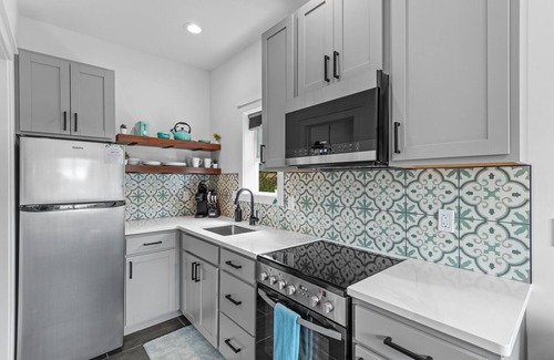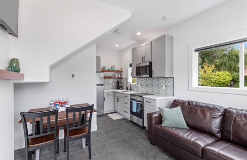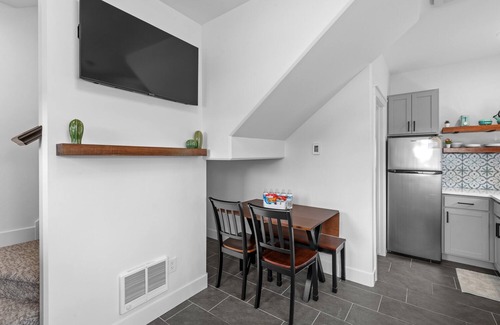 Nestled within a quiet cul de sac, this home is tiny but mighty! As you enter the front door, the small living room is furnished with a couch facing a 42” flatscreen TV to relax and enjoy time with family or friends. The kitchen is nearby with a small dining table, bench, and chairs. The one bathroom is just off the kitchen with a full bath and vanity. The stairs near the front entrance lead to a queen bed to the right, which faces a 42” flatscreen TV. There are two twin beds to the left and a small sleeping nook above the stairs that we call the “dog house”. Please keep in mind it’s a tiny house. While the house sits on it’s own city lot, the interior space is small. If space and privacy are important to you, this may not be the best fit.