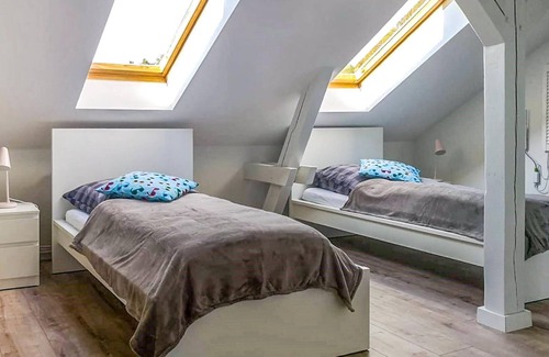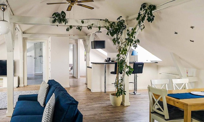 Spend a relaxing vacation in this bright, modernly furnished vacation apartment. It welcomes your guests in a modernized manor house. Take breakfast outside on warm days and enjoy the first rays of sunshine while having your morning coffee on the terrace. Later, settle down on the sofa and watch a movie together with your extended family. The modernly equipped vacation apartment leaves nothing to be desired.