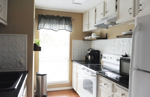 This is a townhouse that is 3 levels with 1450 sq. ft . There are tall windows that make you feel like you are in the trees. It is light and open and a fun place to stay! The first level is the living area that walks out onto the large deck. On the 2nd level there is the kitchen, dining, bedroom (queen), and a 1/2 bath with toilet and sink. The kitchen includes a refrigerator, electric stove/oven, dishwasher, microwave, K-cup and drip coffee maker. All cutlery, plates, bowls, glasses, coffee cups, pots, and pans are stocked. The 3rd level has 2 bedrooms (queen room and bunk room) and a full bathroom. There is also a shower room in the garage. We have a washer and dryer, also in the garage.