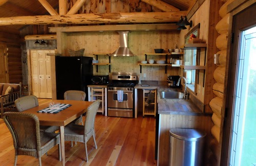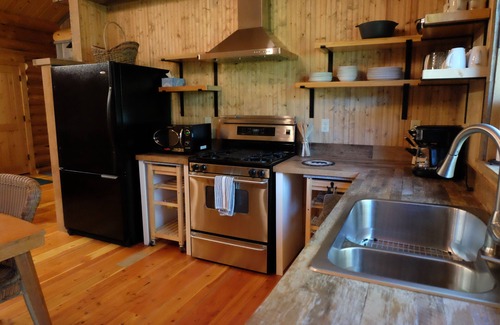 There is a complete kitchen, dining table with chairs, great room, covered deck plus secluded sitting area just outside the kitchen door.