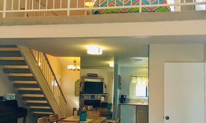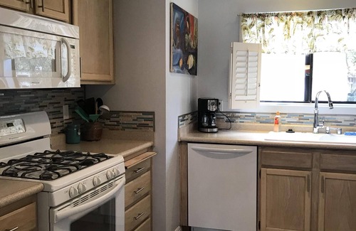 The “Mermaid Lounge” has a kitchen, living/dining area, two bedrooms (plus loft), a full bath (Jack and Jill) and a half bath downstairs. With tile throughout, it’s okay if you bring in a little beach sand. Upstairs there’s carpeting in the loft next to the walk-in closet and a ¾ bath. According to VRBO, the average hotel room is 325 sq. ft. Here you can bring your groceries and spread out in about 1,300 sq. ft. Just right for a maximum of 6 guests. Master bedroom has a king size bed, loft has a queen size, and the “surf room” has a daybed and twin bed. Add a Pak n Play for little ones at no charge. The kitchen provides what you need for preparing meals with mostly new appliances; use spices, cooking oil, coffee, or anything you can find there. The washer and dryer are just around the corner in the hallway where you'll find all the laundry supplies you will need.