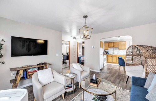As you stand in the middle of the kitchen and living room areas this will show you the bathroom and both bedrooms. The bathroom is fully renovated which includes a tub/tiled shower and beautifully designed tile floor. Each bedroom is furnished with a queen bed. Note: The bedroom to the right has a locked barn door. Inside the locked door are extra supplies for our cleaners. The bedroom to the left has plenty of hangers for everyone to utilize.