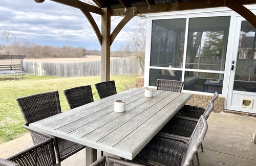 •Covered patio with dining table with gorgeous views of the oxmoor farm