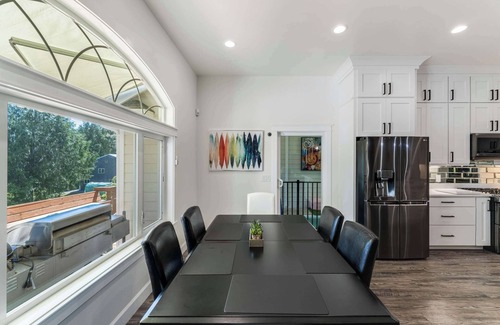 A formal dining room set up for 8, with a table extension for up to 10 for large meals or a special occasion. Large bay window with views of the mountain and trees, and high ceilings with a beautiful hanging light make the space bright and light.