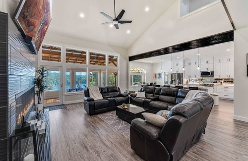 Welcome to THE Ultimate Lakefront Villa! Perched on 13 acres, this luxurious 5-bedroom, 4.5-bathroom home was designed for creating once in a lifetime memories with your family and friends. As you step inside, you'll be greeted by a spacious living area with comfortable seating and a cozy fireplace, and a modern kitchen. A private lakefront dock, there's no shortage of activities to keep you and your family entertained.