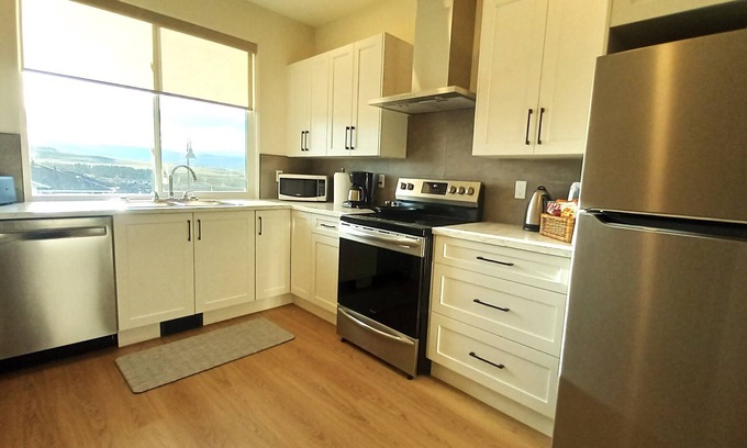 Explore Urban Tranquility, a 1BR suite on a new serene cul-de-sac location, available for minimum 12 day bookings. Enjoy private parking, and proximity to Kal Lake and Kal Beach. Strategically located in a fresh subdivision, this residence redefines refined living for the discerning professional. Within 2 minute drive to beach and city amenities, 25 min. to ski hill and 2 min walk to parks and trails.