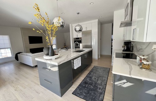 Cook a delicious meal in your chef's kitchen with an induction stove and stainless steal appliances. Sit with your family at the oversized quartz countertop kitchen island for a breakfast basking in the sun while looking out on your backyard. Enjoy the spacious open concept kitchen-living room with a gas fireplace to heat up your cool summer nights. Throw on the fireplace light show to set the mood while enjoying a drink from your speakeasy-inspired bar with a wine fridge.