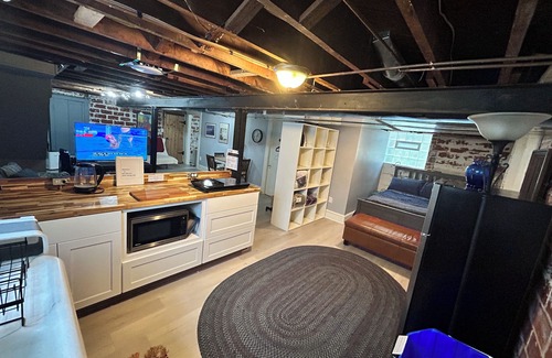 There is a great feel to the place—exposed brick and joists with modern amenities. There is Wi-Fi, a smart TV, a kitchennette with an induction cook top, microwave, toaster oven, coffee maker, fridge, and dishes.