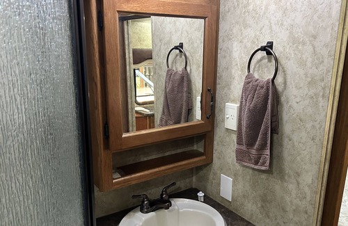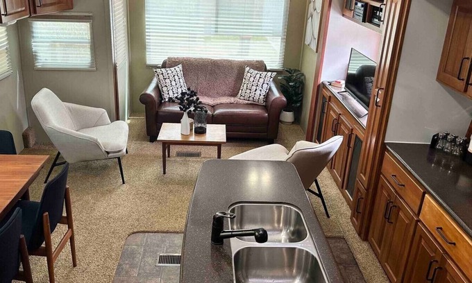 Please access the Park home from the street side… you will see pavers that will take you to the private front deck of the Park Home. PLEASE ALSO NOTE: Should you be a larger group, there is the option to book the cabin - sleeps 4, on the same property.