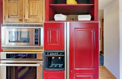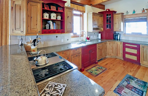 Soak in the seven-person hot tub offering expansive views of the continental divide. The gas grill is perfect for warm-weather barbecues. Inside, the grand living room boasts vaulted ceilings, exposed log beams, dramatic floor-to-ceiling windows, and an impressive stone wall with a gas fireplace and built-in bookcase. Sprawl out on the leather furniture and enjoy a show on the 46” flat-screen TV with cable, or catch a movie screening in the home theater on the 108” projection screen that includes Blu-ray, Xbox 360, and cable. Convene in the game room downstairs for foosball. The chef of the group will appreciate a well-equipped kitchen sprinkled with fun red design elements and updated stainless steel appliances. There is a dining table with scenic views, and a downstairs kitchenette for storing snacks. A washer/dryer and complimentary Wi-Fi are provided.