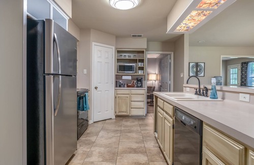 The inside of the house is just as inviting as the outside. There are four bedrooms, each with a king size bed. The master is at the back of the house to maximize the view of the lake. It has its own TV and attached bath with an oversized soaking tub and separate shower. Off the master is a sitting room with a queen size pull-out. There is a second master at the front of the house also with its own TV and an attached bath with a shower tub combo. There are two more good size bedrooms that share a full bathroom with a tub shower combo.