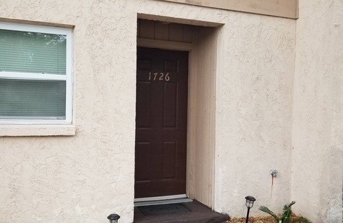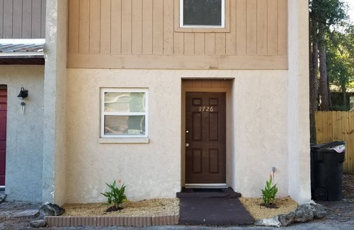 Fully equipped & well-stocked 987 sq. ft 2 BR/1.5 BA townhouse. Free parking at door, Smart TVs in all rooms, WiFi, laundry room with washer/dryer, 2 queen beds, pest control, fully-equipped kitchen with all you'll need and more including coffee keurig, microwave and full-sized appliances and air fryer. Sleep comfortably in bedrooms with queen beds, dressers, desk & ergonomic chair, and wall mounted smart TVs. Unit sleeps up to six people however the 3rd bed is a luxury king air mattress for use downstairs. Laminate wood flooring & tiled throughout except carpeted staircase. We are pet friendly (3 pet max - dogs & cats only) with minimal $ per pet, per entire stay fee. No smoking or vaping indside. No house parties. Home has many extras including board games, books and a privacy fenced back yard with charcoal grill, picnic table, firepit & lawn chairs. House has central air and heat (guest controls), laundry room with washer and dryer and is protected by Florida Pest Control. Central and conveniently located near I-75, a less than a 15 minute drive to UF Ben Hill Griffin Stadium, Exactech Arena, Celebration Pointe, Alachua County Sporting Complex, all 3 hospitals, shopping & more. The diverse, active community, is reflective of everything Gainesville embodies (students, families & working professionals, home bodies). Friendly neighbors who may mill around in their yards, play a little music from time to time, but no safety concerns. The only downside is the lack of curb appeal. Unit has a basic look and older townhome design (nothing fancy - no curb appeal); and neighborhood is not well kept (nothing we can control). The exterior can fool you as the real reward is what's inside. We look forward to hosting you! Be prepared to email or text a copy of the primary guest's photo ID when booking. Primary guest should also be present at check-in. Video and audio enabled cameras are located on exterior only to monitor both entrances and to assist with the self check-in process.