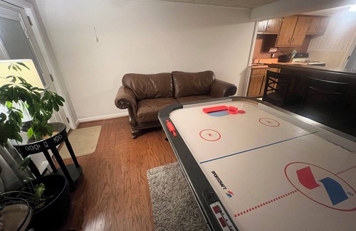 Boasts a spacious bedroom with queen size bed and brand new updated bathroom. Large living room with attached area with hockey table. Nice kitchen with bar.
