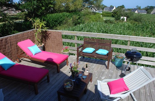 You will appreciate the calm surrounding on the large wooden terrace (sunbathing, deck chairs, bench, small table, deckchair, garden furniture and barbecue weber).