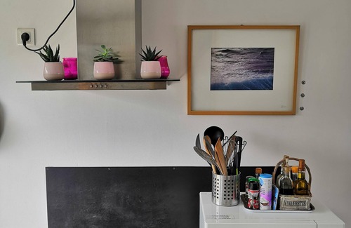 The kitchen is equipped with an induction hob, a microwave, a fridge, a kettle, a toaster, a coffee machine, a mixer, a griddle and a complete cookware ...