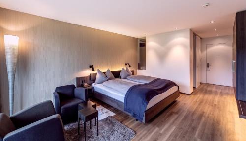 This stylish hotel is located between the southern banks of Lake Constance and the Swiss Alps, next to the golf course. It offers modern wellness facilities, free internet and free public parking. The Wellnesshotel Golfpanorama in Lipperswil can be found 6.2 mi west of Konstanz, close to the A7 motorway. You can enjoy panoramic views of the Alps including the Churfirsten and a golf lake. Each room in the Wellnesshotel Golfpanorama features an elegant bathroom with bathrobes and slippers, and a cable TV. Wellness facilities include an indoor pool, saunas, a hot tub, a steam bath and various massages and beauty treatments. Delicacies of the region around Lake Constance are served in the Lion d'Or restaurant. A large network of hiking, Nordic Walking and biking paths surrounds the Wellnesshotel Golfpanorama.