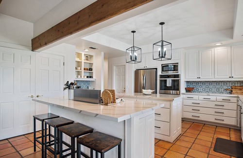 Stream shows on the 75" smart TV or relax with a book on the sleeper sofa in the den. A desk with a printer and monitor offers office space. The newly remodeled kitchen boasts quartz countertops and stainless steel appliances. The coffee bar has a new coffee maker and milk frother. Perch at the island counter or gather for meals around the dining table. Round out the day with a refreshing dip in the newly built pool or a soothing soak in the hot tub.