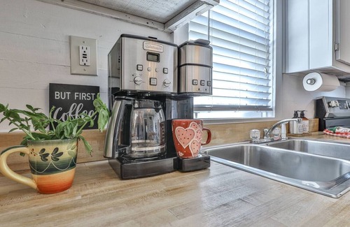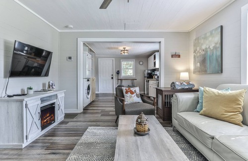 Guests will find 2 king size beds, nightstand lamps with charging ports, a butcher block kitchen table with seating for four and a comfy leather sofa arrangement with plenty of blankets and pillows to watch a movie or show of choice. Furniture covers are provided for the dogs to allow them to snuggle up with you on the sofa or in front of the electric fireplace.