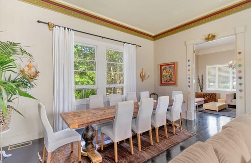 A long private 50m driveway reveals this beautiful property with manicured lawns and fountain. Enter through the ornate lead light doorway and you are greeted by the formal parlour room. In the main house there are 3 bedrooms, a Queen, a Queen with 2 singles and a master bedroom with a King. Shared by these bedrooms there is a truly exceptional family bathroom; an entirely open travertine tiled wet room with a feature reclaimed stained glass window from the Carrington Hotel, ornamental fireplace and a freestanding claw and ball bathtub. There is also a laundry in this section of the home with a washer, dryer, toilet and basin.