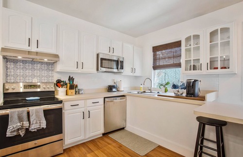 Two parking spaces on site with free street parking on adjacent streets. Driveway and paths are lit. Guests will receive unique private code prior to check-in for use on their private entrance. Guests are able to access both upper and lower patio and backyard spaces.