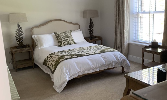 The room overlooking the terrace (originally the station platform) local village and rolling hills beyond has a more luxurious feel. It is situated on the first floor accessed via the stairs and has a king bed with luxurious white cotton bed linen, large sash window with both interlined curtains and a wooden blinds for privacy and to ensure a comfortable sleep.