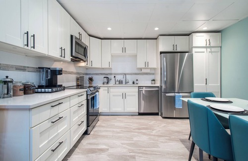 This above ground garden suite boasts large windows and opens up to a private, south facing 800sqft patio! There are three bedrooms with modern furnishings and ample closet space. Two of the bedrooms have huge windows with lots of natural light and include queen beds. The third bedroom has a double bed and is very quiet (for those that are light sleepers or for little ones who go to bed early and need quiet).